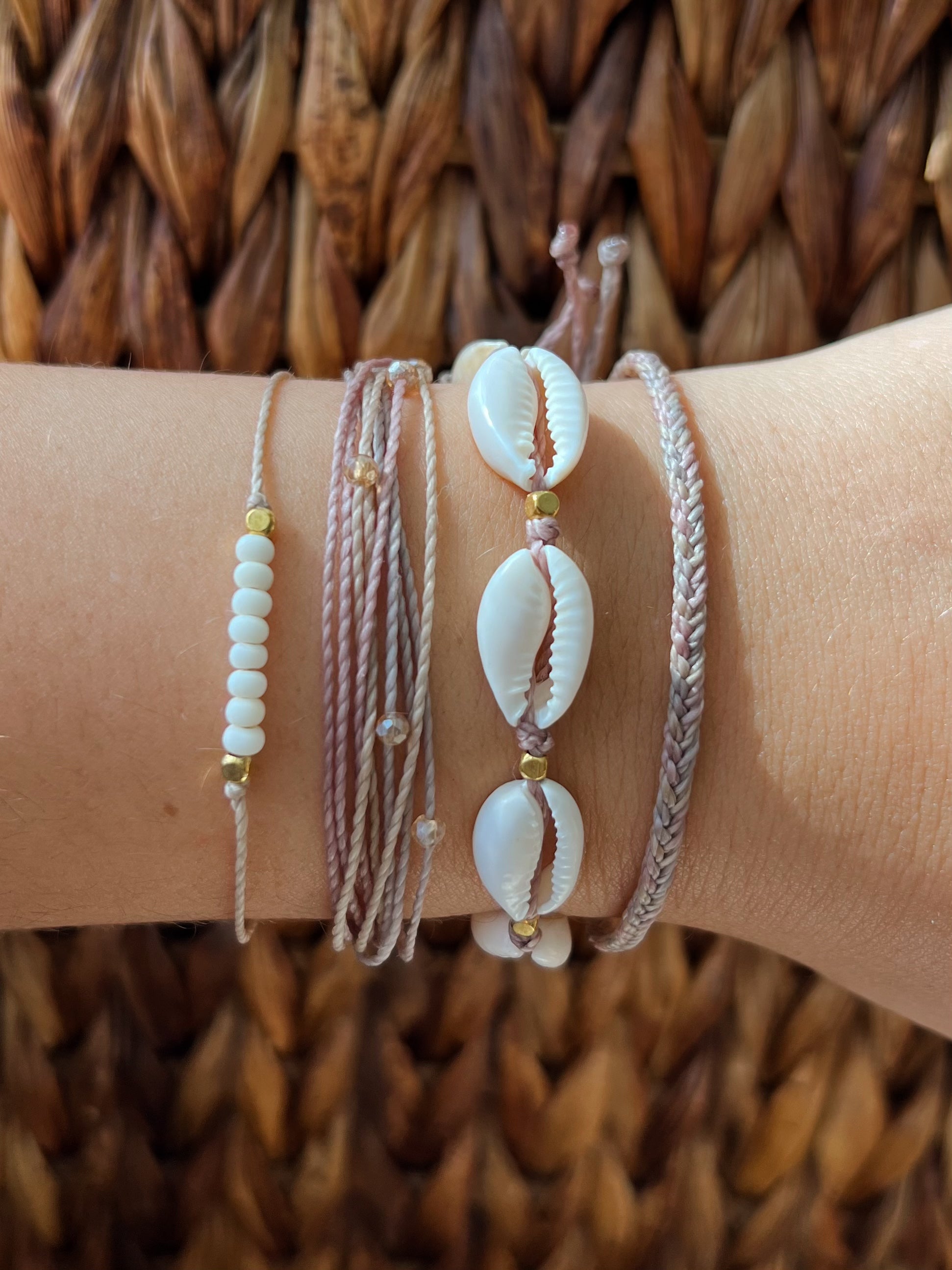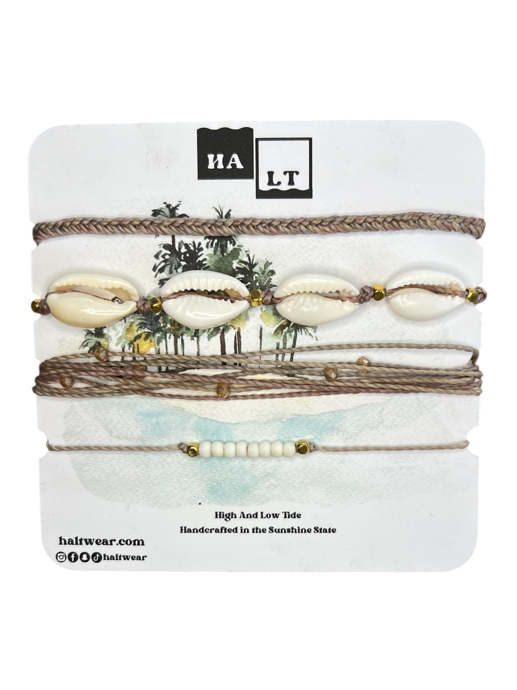 Get ready for the day in classic boho surfer style in our North Shore Bracelet Stack! This set features cowrie shells, delicate glass beads, and gold accents.