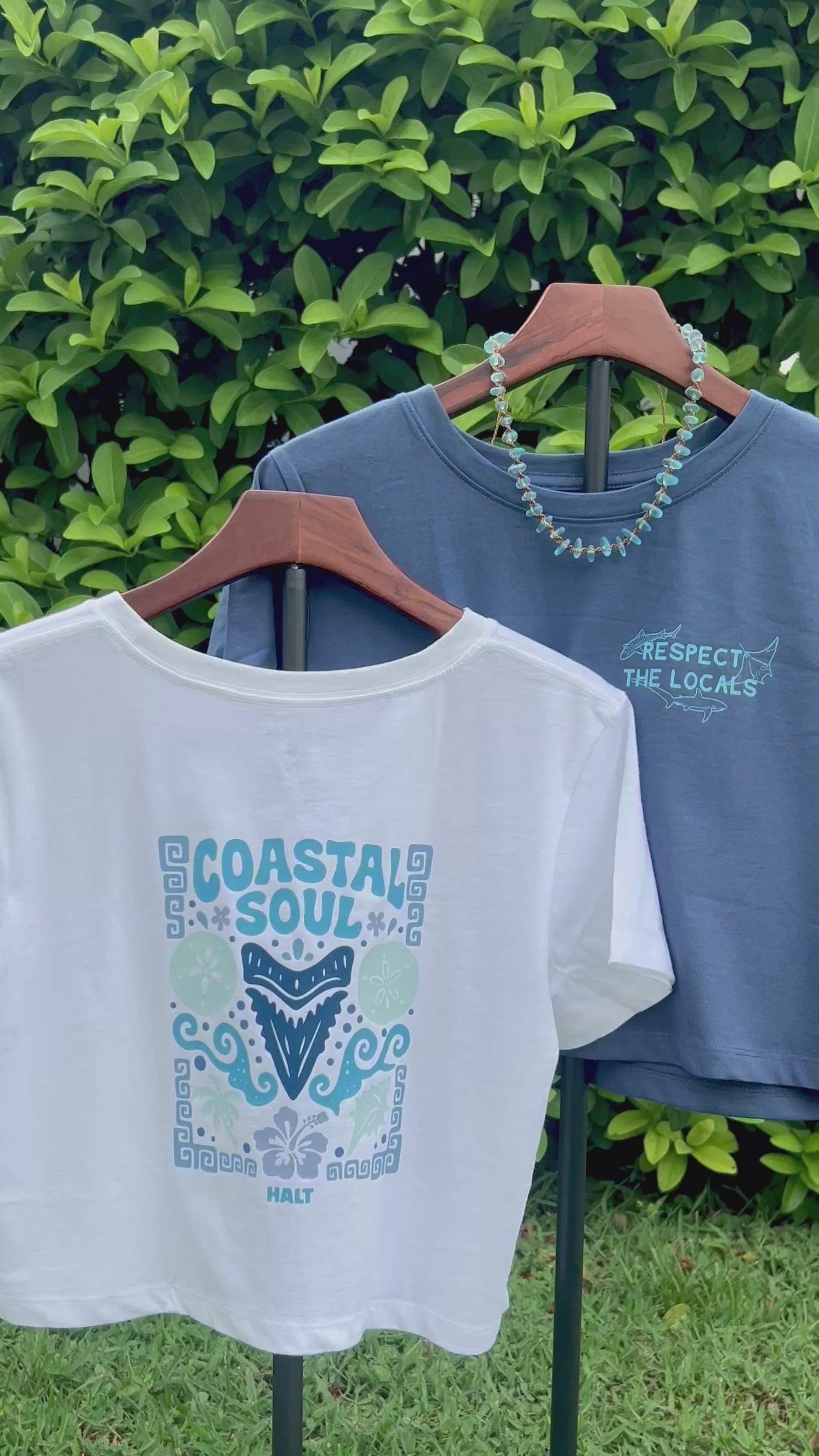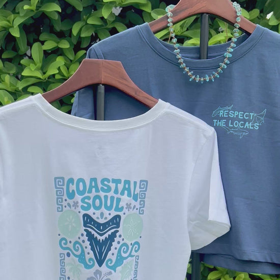 Get ready in a relaxed, laid-back look with our new collection of coastal tees. Our Coastal Soul Tee features tropical icons around a Florida shark tooth.