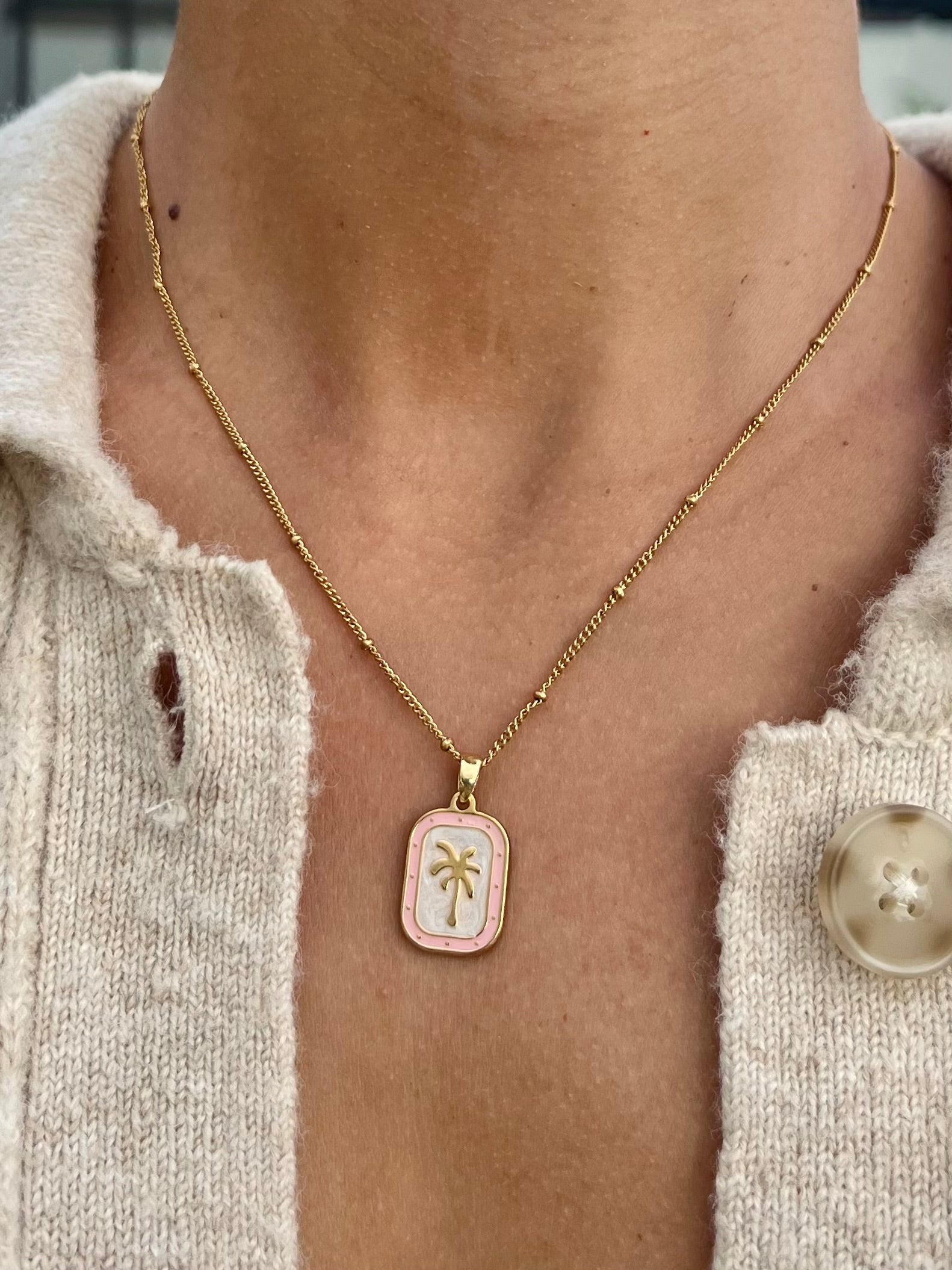 Add some coastal charm to your jewelry collection with our Pink Palms Necklace. Featuring a pink accented palm tree charm on a dainty chain, this piece is sure to add a beachy surfer touch for any occasion.