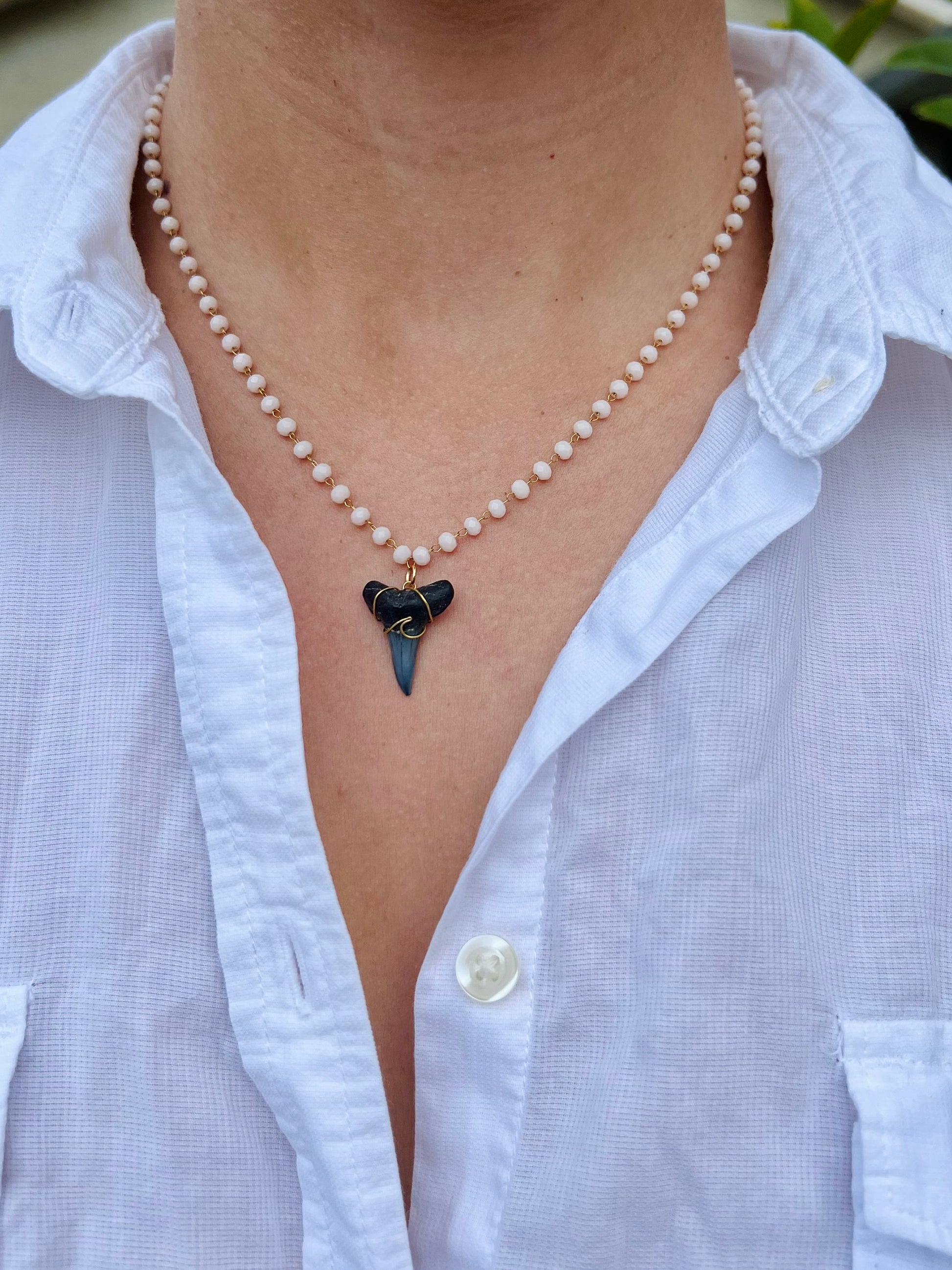 Add an elegant beachy look to your outfit with our Wire Wrapped Wave Shark Tooth Necklace! Our teeth are found on the shores of Venice Beach Florida, and this stunning piece is sure to turn heads. With an unique white beaded 18K gold plated chain, this style is the perfect ocean accessory.